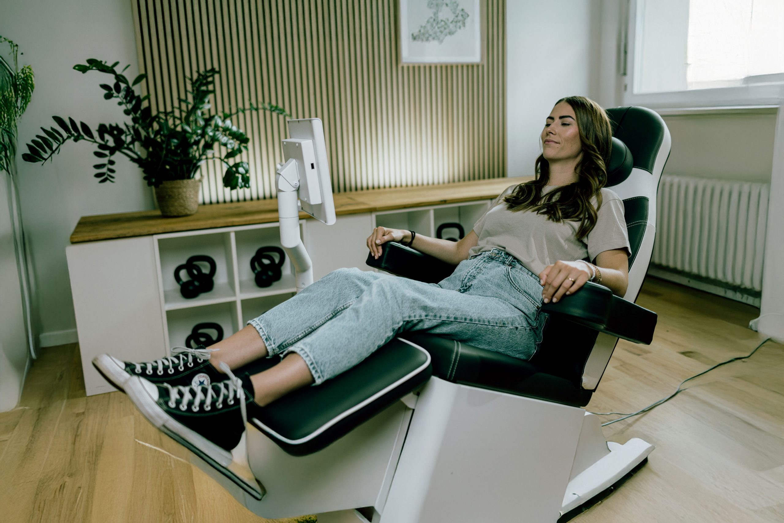 Du sitzt vollständig bekleidet auf dem Pelvi-Stuhl. Die elektromagnetischen Impulse aktivieren deine Beckenbodenmuskulatur intensiv. Du spürst die Kontraktionen, aber es ist nicht schmerzhaft.