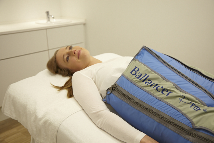 Wir klären Ihr Behandlungsziel, z. B. Entgiftung oder Reduktion von Wassereinlagerungen. Danach ziehen Sie die komfortablen Ballancer-Manschetten an, die Beine, Hüften oder Arme umschließen.